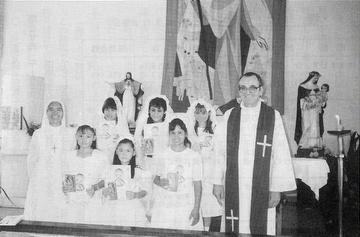 …枝の主日には、多勢の信者さん達が、枝を持って集まりました。悪天候のため、行列はやめて、教会内で枝の祝別がありました。 この日の福音は、4つの言葉で読まれました。スペイン語、グァラニー語(原地語)、ドイツ語、日本語でした。私達のコロニアでは、大体、この4つの言葉が話されているからです。 この国の文部省の教育改革で、二、三年前から、小学一年生から、スペイン語の他に、必須科目として、グァラニー語も勉強させるようになりました。それで、日本人の子供たちは、一年生から、日本語・スペイン語・グァラニー語も勉強することになります。言葉が分からないため、落第する生徒も居ります。 日本政府の援助で、コロニアから主要幹線道路に向けて、アスファルトが敷かれるように、昨年3月から工事が始まりました。雨のため、しばしば中断しておりますが、5年計画で、一八〇kmが、アスファルトになる予定です。 ![]() 初聖体を受けた子どもたち(左端)Sr林静子 『父兄が、教育に関心』礼拝会 斉藤クニ子